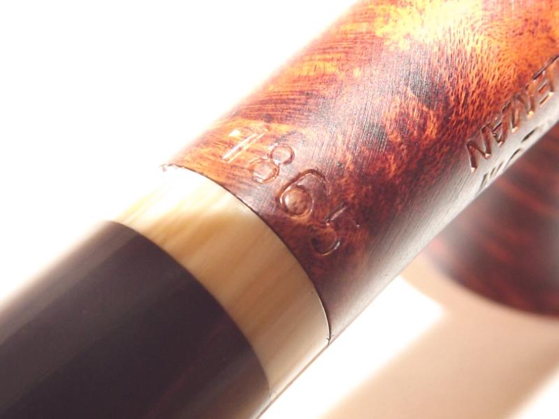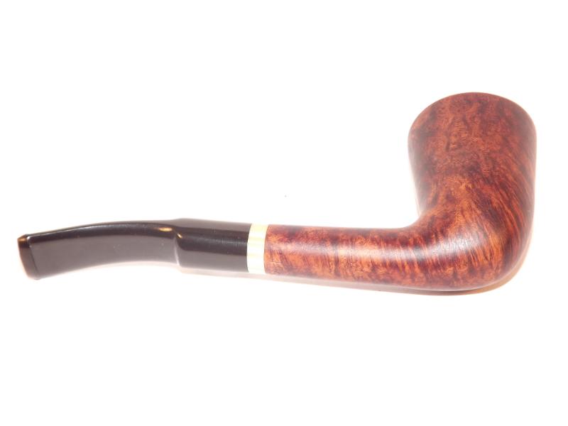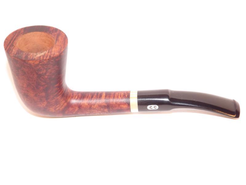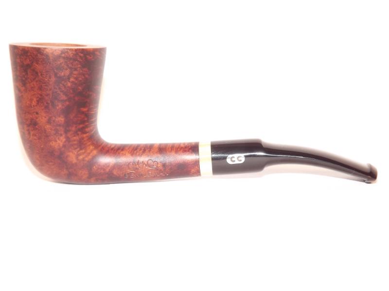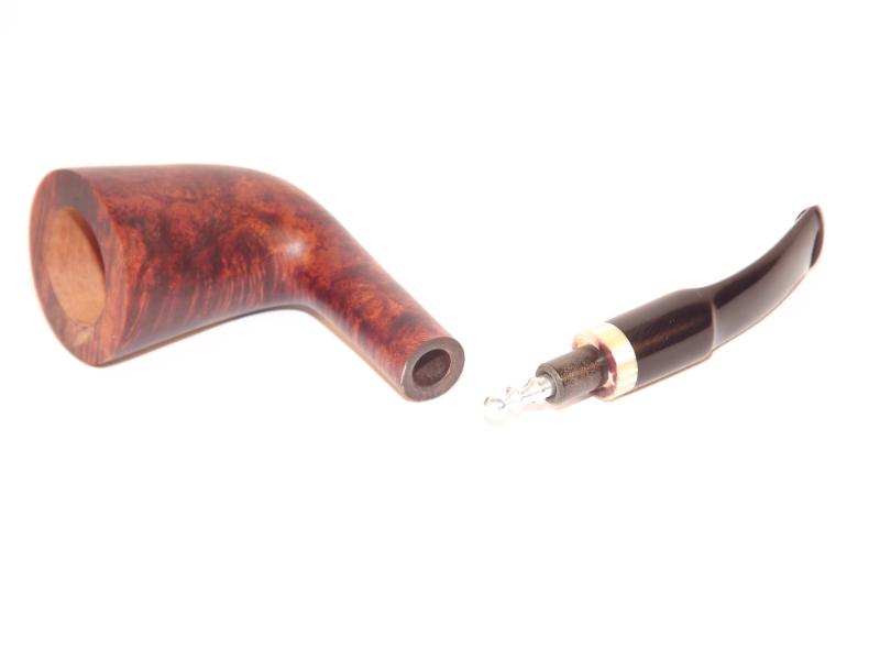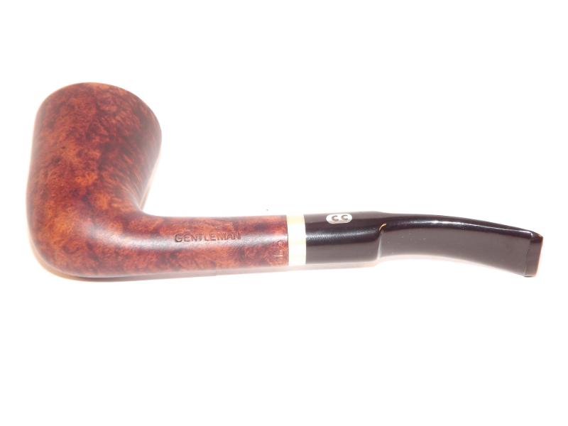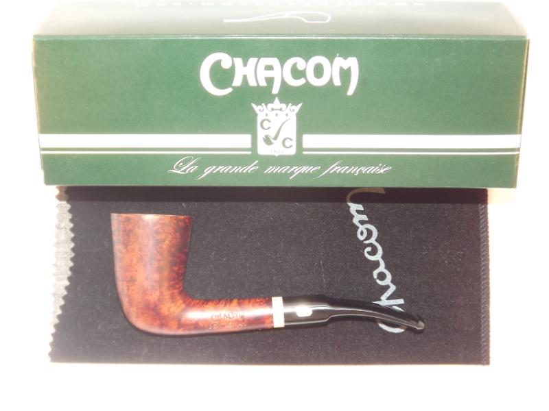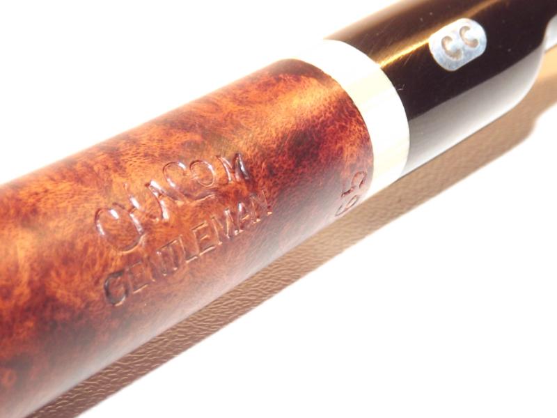A Chacom Gentleman 1865 pipa bruyerből készült barna polírozott pipafej, egyenes szárral, fekete, nyerges akril szopókával és filter nélkül. A szárat fehér gyűrű díszíti.