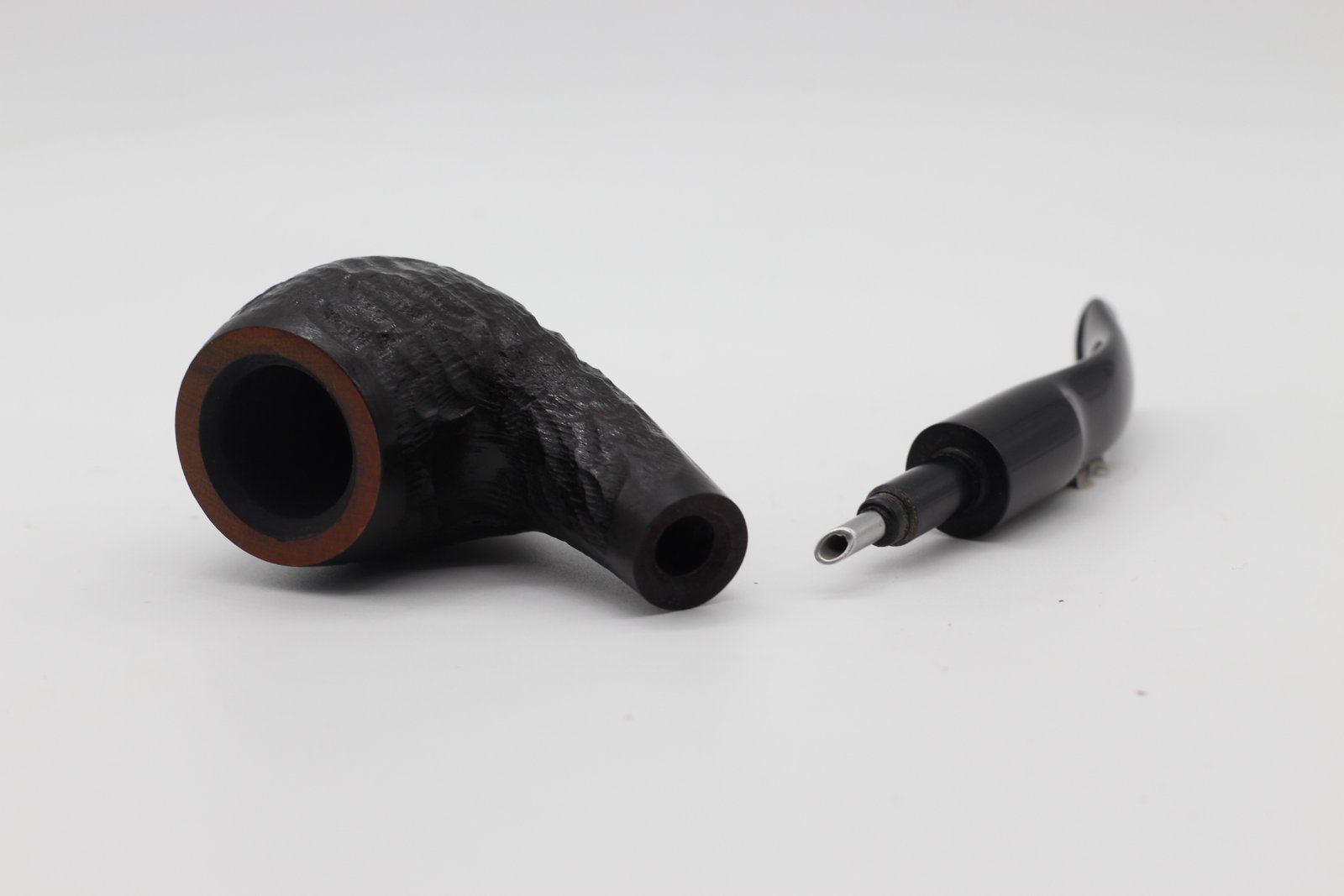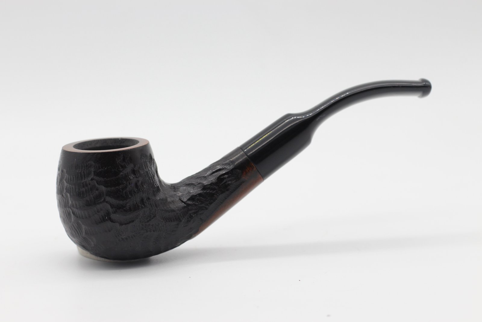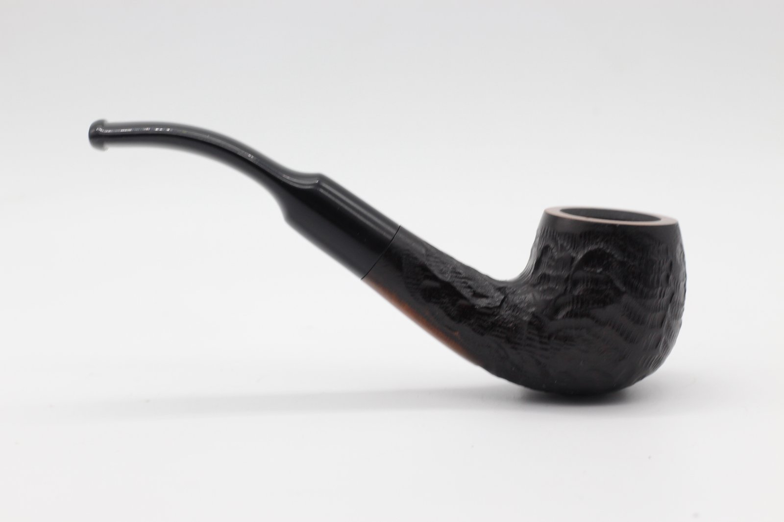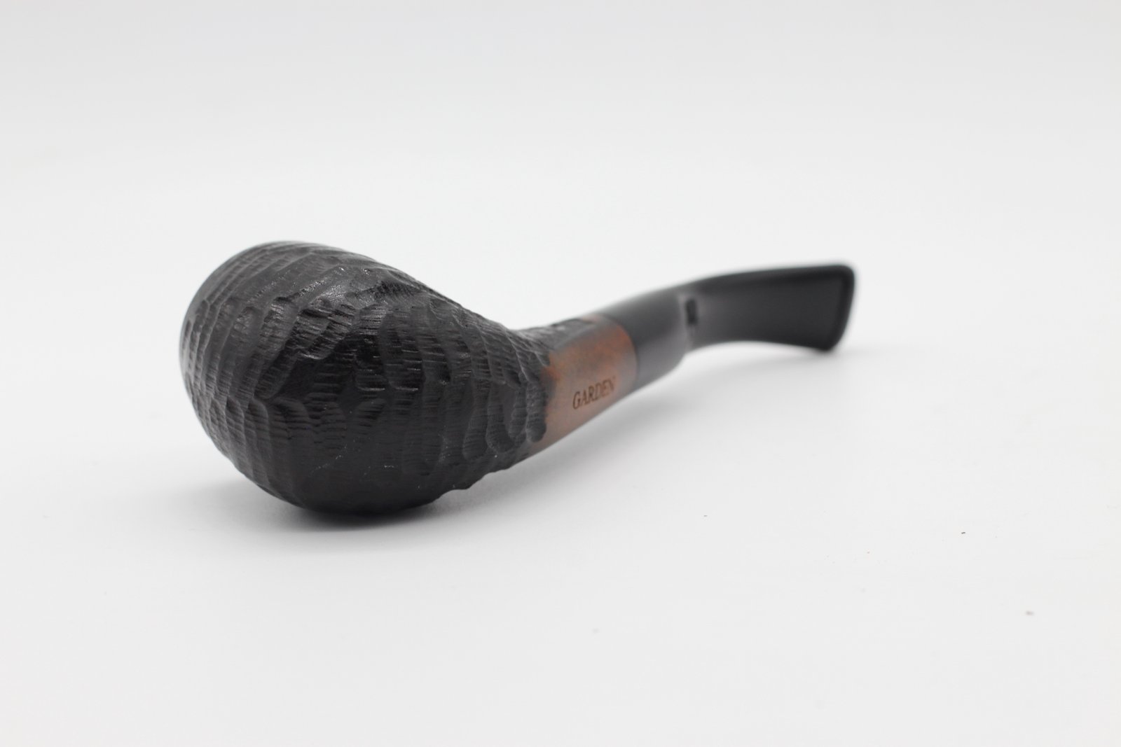 A Lorenzo Garden Sand pipa bruyere gyökérből készült, kézzel rusztikolt, fekete pipafej, közepes kazánmérettel, hajlított szárral és fekete nyerges akril szopókával. Filter nélküli, fém adapterrel.