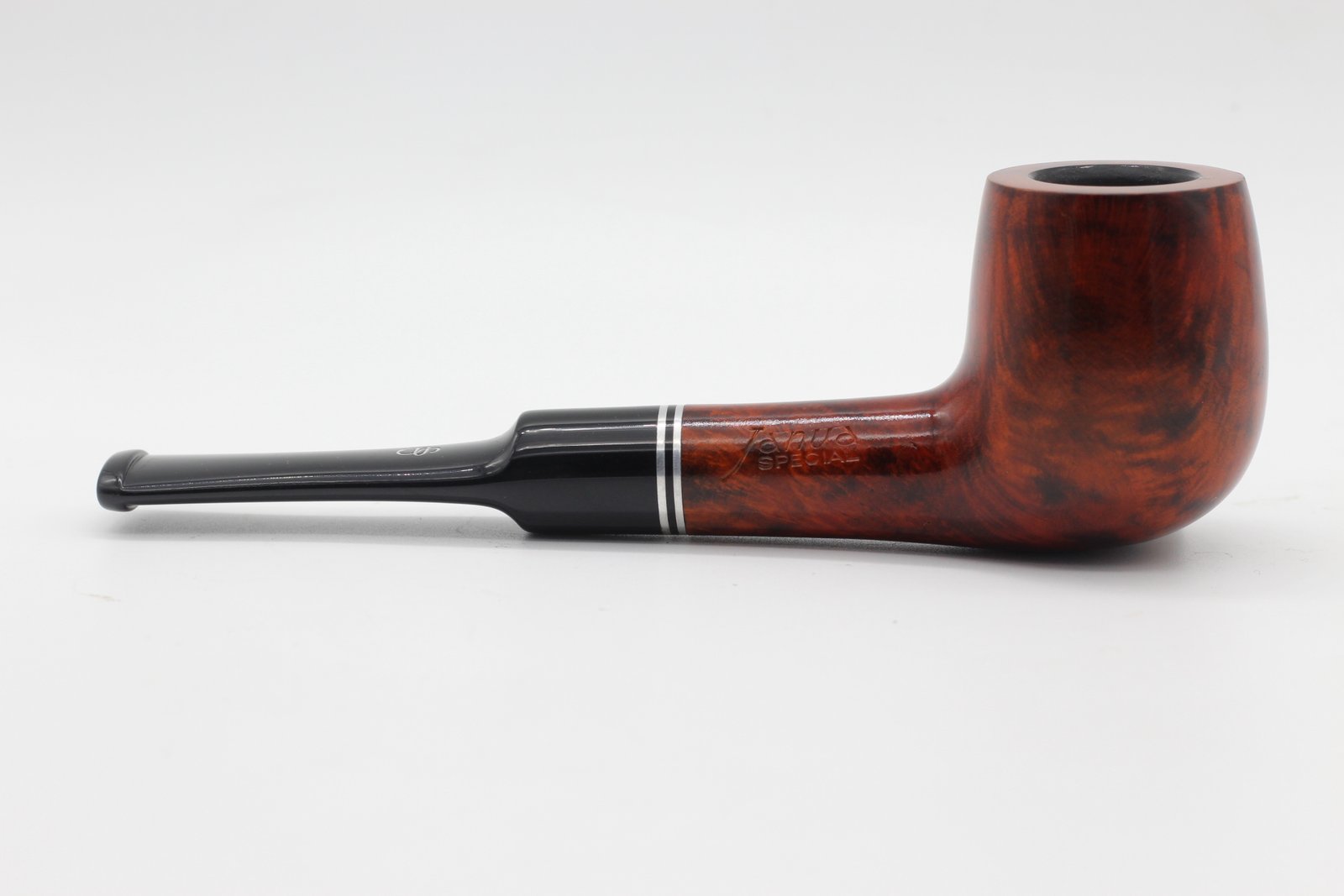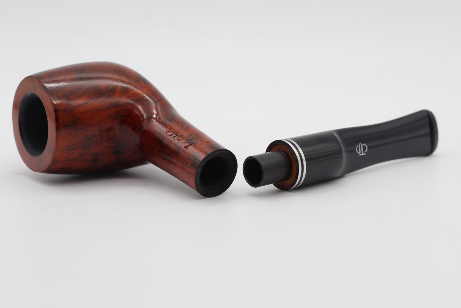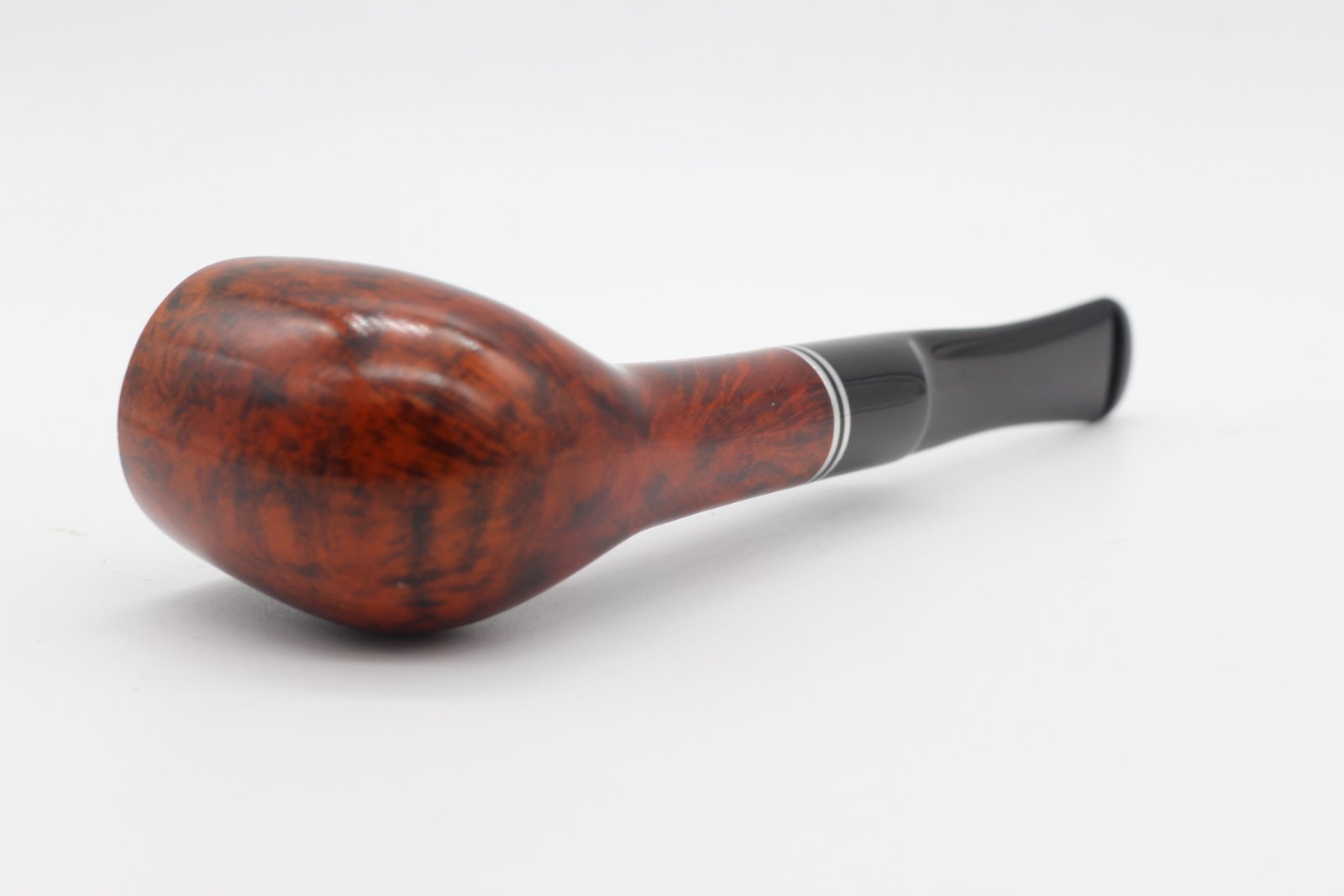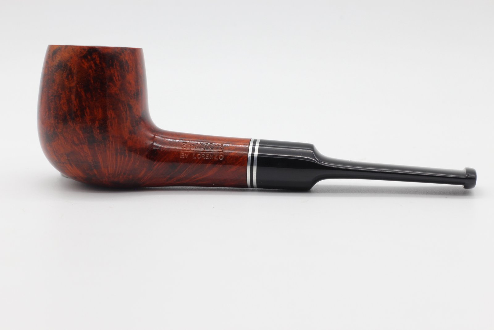 Lorenzo Janua 420R Brown Polish pipa bruyere gyökérből készült polírozott barna színű pipafej, egyenes, nyerges, fekete akril szopókával, 9 mm-es filterrel és közepes kazánmérettel. Szárát dupla gyűrű díszíti.
