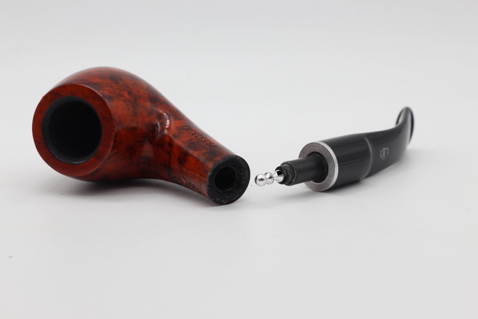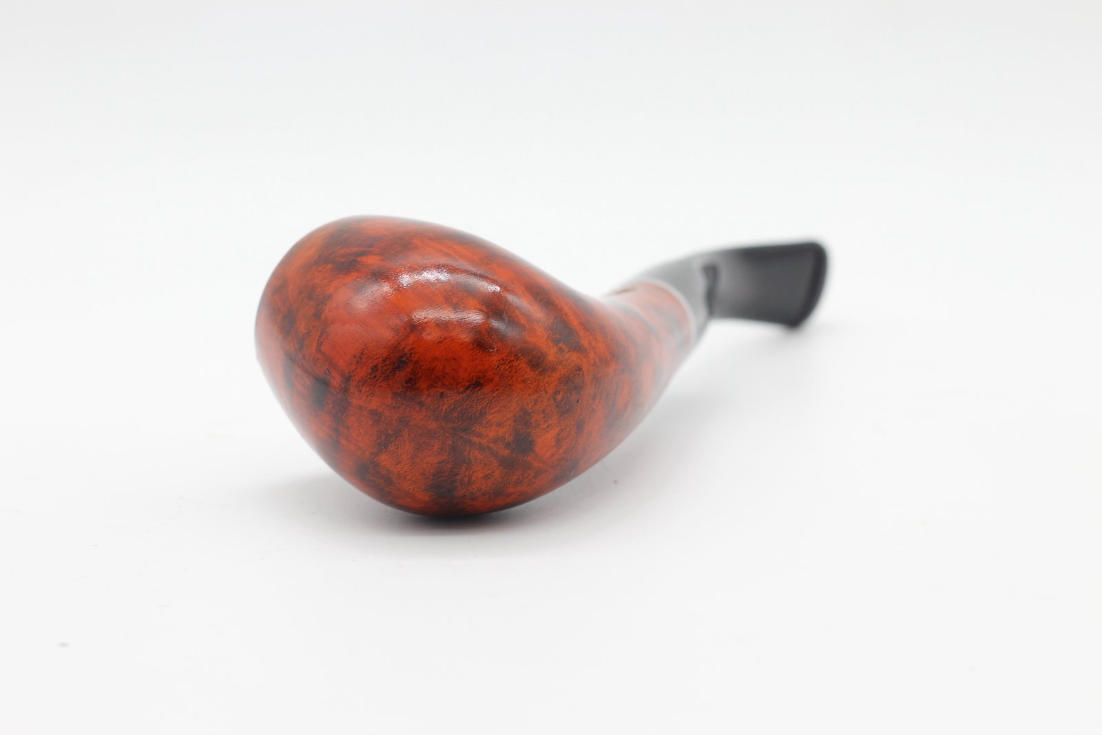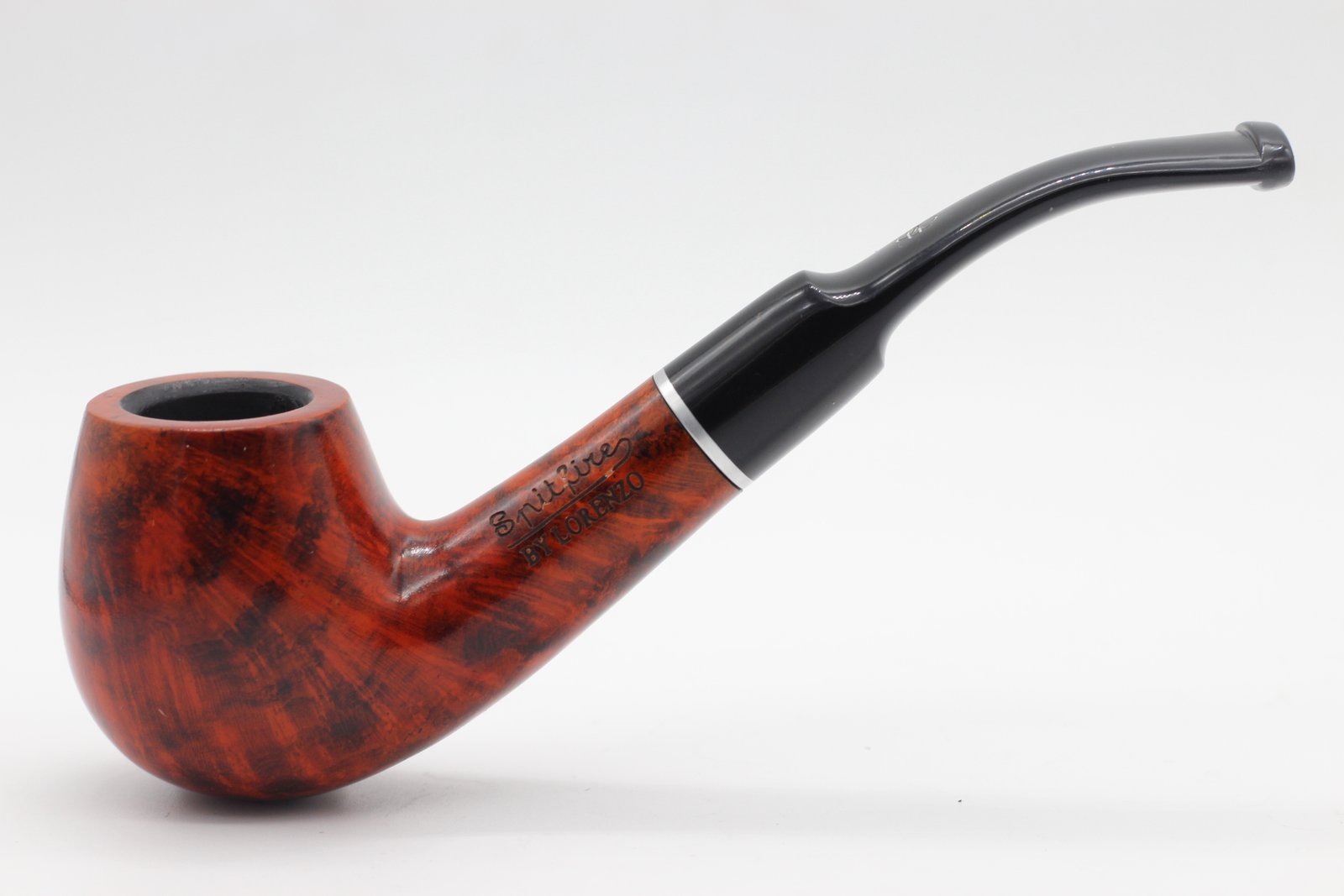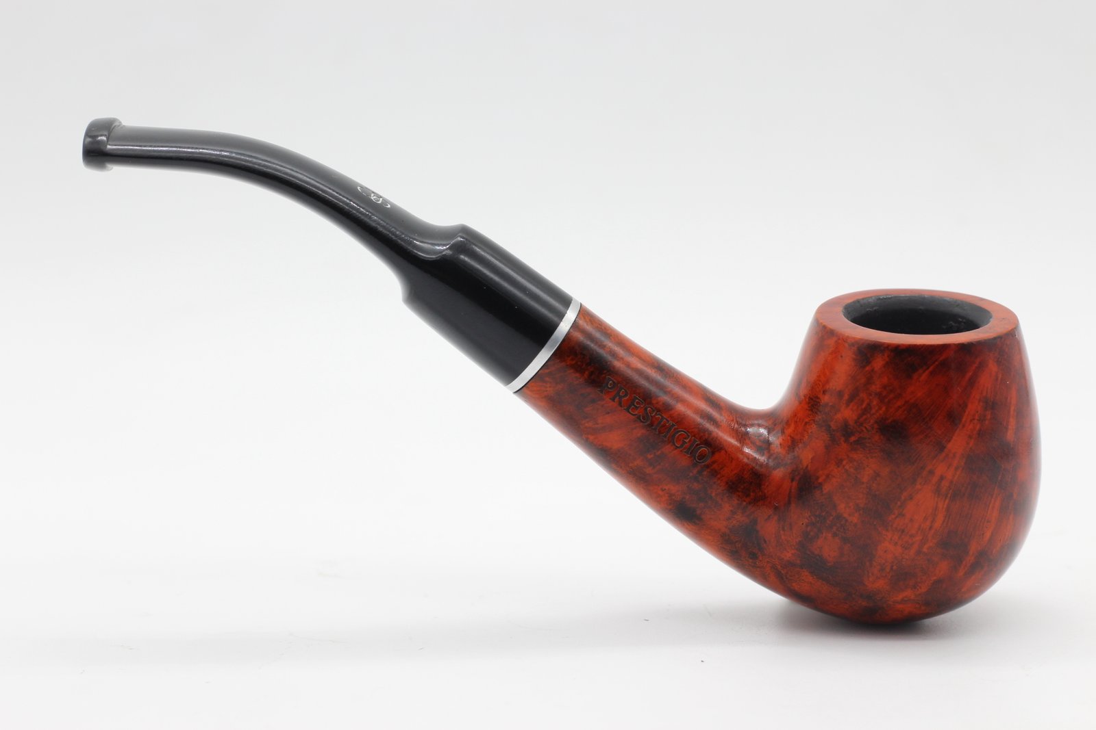 Lorenzo Prestigio 311 Brown Polish pipa bruyere gyökérből készült polírozott barna színű pipafej, hajlított, filter nélküli, fekete nyerges szopókával és közepes kazánmérettel. Szárát keskeny, ezüst színű gyűrű díszíti.