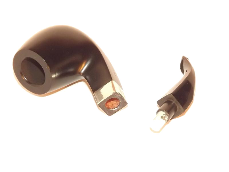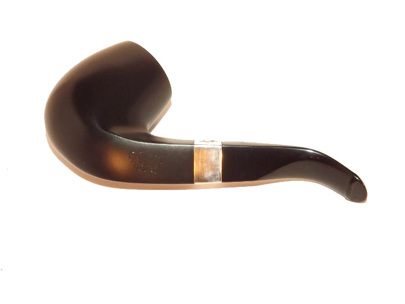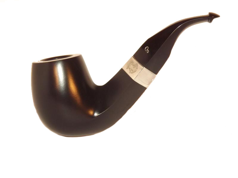 Peterson Sherlock Holmes Milverton Ebony pipa bruyere gyökérből készült fekete pipafejjel, gyémánt alakú szárral, melyet egy szép gravírozott Sterling-ezüst gyűrű díszít és 9mm filteres, fekete P-lip szopókával.